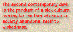 The second contemporary devil is the product of a sick culture, coming to the fore whenever a society abandons itself to wickedness. During the period of decadence in France prior to the French Revolution, the Marquis de Sade became infamous for his satanic writings. The marquis proposed a philosophy of radical selfishness that theoretically approved of murder, the torture of children, and cannibalism.