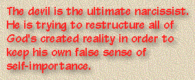 The psychological term for such irrational willfulness is narcissism, and we are all aware of people who to a greater or lesser degree exhibit this tendency. Such people eventually accept reality (however painful it may be) or they defy it by either withdrawing into their own inner world or attempting to reconstruct reality so that it fits their false ideas. (Adolf Hitler and Joseph Stalin are two individuals who took the second approach.) The devil is the ultimate narcissist. He is powerful and willful enough to attempt to restructure all of God's created reality in order to keep his false sense of self-importance.