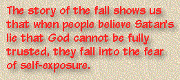 The story of the fall shows us that when people believe Satan's lie that God cannot be fully trusted, they fall into the fear of self-exposure. After Adam and Eve had eaten from the forbidden tree, they became conscious of their nakedness, made a feeble attempt to cover their shame with fig leaves, and tried to hide from God (Gen. 3:7-10).