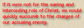 Anyone who has felt the force of the accuser's power realizes how helpless we are to resist his temptations and accusations in our own strength. Each of us is so compromised by sin and impure motives that we can be confused, paralyzed, and even driven to despair when we are exposed to the merciless attack of either the fleshly nature within or demonic accusations without. If it were not for the saving and interceding role of Christ, we would quickly succumb to the charges of our accusing enemy.