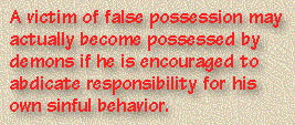 a victim of false possession may actually become possessed by demons if he is encouraged to continue abdicating responsibility for his own sinful behavior. By pointing out the dangers of demonic obsession and false possession, we are by no means denying the reality of demonic influences. Demonic influences may be involved in many (or even most) cases of obsession or false possession. But it is impossible to rid a person of demonic influence as long as he has not yet faced the "core" problem of his personal sin and rebellion.