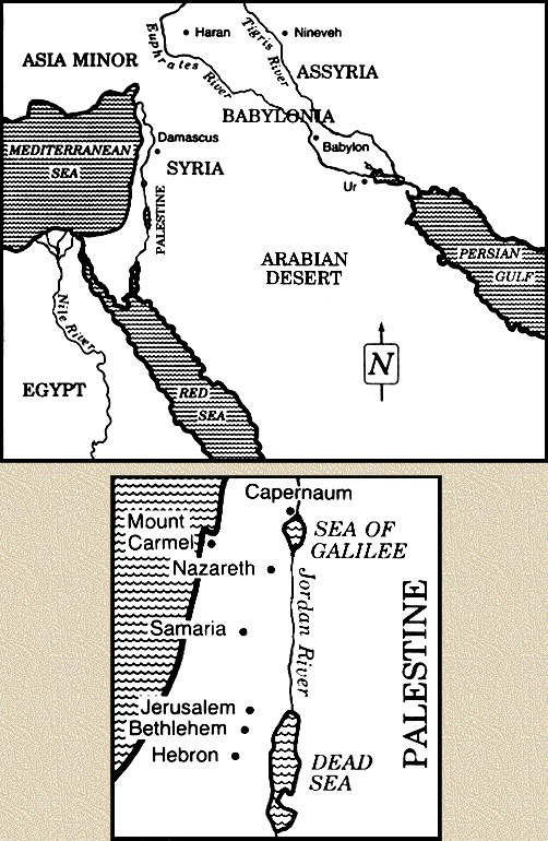 Palestine, the site of most of the events of the Bible, is a good land--a land described as "flowing with milk and honey" (Ex. 3:8). It is bounded by the Mediterranean Sea on the west, the Arabian Desert on the east, the Sinai Peninsula on the south, and Syria on the north. Palestine may be divided north to south into four natural regions: (1) a flat coastal plain along the Mediterranean, (2) the central highlands, (3) the Jordan River valley, including the Sea of Galilee and the Dead Sea, and (4) the high ground east of the Jordan.