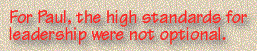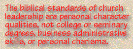 What should set these individuals apart from others in the church?  The biblical standards for church leadership are personal character qualities, not college or seminary degrees, business administrative skills, or personal charisma. We may tend to select our leaders on the basis of personal success or social standing. But Paul said to search deeper, to look for character qualities that reveal a deep-seated faith reflecting integrity, maturity, and stability.