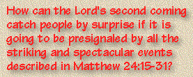 How can the Lord's second coming catch people by surprise if it is going to be presignaled by all the striking and spectacular events described in Matthew 24:15-31? That's a key question. The best answer seems to be found in seeing the Lord's second coming as occurring in two stages. First He will come to catch up (or "rapture") His own people. This event will be unannounced. Then He will return to establish His kingdom over the earth. This event will be clearly presignaled.