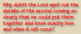 Purposeful Ambiguity. If you have read our Lord's prophetic words recorded in Matthew 24, Mark 13, and Luke 17 and 21, you probably wish you could find somebody who would give you a crystal-clear explanation of all He said. If so, join the club! Many people have had the same experience and asked, "Why didn't He spell out the details of His second coming so clearly that we could put them together and know exactly how and when it will occur?" The answer is quite simple: He didn't set out to give us this kind of information. His aim was to teach us that we should live in continual readiness for our meeting with Him.