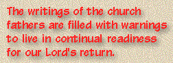 with warnings to live in continual readiness for our Lord's return. These men applied the parable of Jesus about the wise and foolish virgins to the people of their age, urging them to keep their lamps burning so they would be ready for Jesus at His return for them. They probably didn't see the need to develop a concept of two stages in the Lord's return because they tended to identify the Antichrist with the Roman Empire and sometimes thought of themselves as already in the great tribulation.