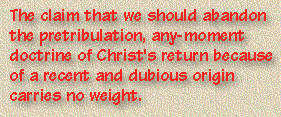 In summary, the claim that we should abandon the pretribulation, any-moment doctrine of Christ's return because of a recent and dubious origin carries no weight. The logic that rejects a teaching on this basis demands that we also reject Luther's teaching on justification, Calvin's insights into God's sovereignty, and Wesley's contributions toward an understanding of sanctification.
