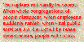 mass absenteeism, people will notice. So no matter how blinded the unbelieving world may be to the events in the sky, they'll soon know that something extraordinary has occurred.