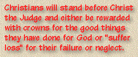 In a small measure, this can help us see what will transpire for the raptured believers at the event called the judgment seat of Christ (2 Cor. 5:10). Soon after Jesus has called His people together with a shout and a trumpet blast, this presentation of rewards will begin in heaven. Christians will stand before Christ the Judge, either to be rewarded with crowns (lit. a winner's wreath) for the good things they have done for God, or to "suffer loss" for their failure or neglect.