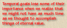 The fact that we don't know the day and time of Jesus' return, though, shouldn't deter us from doing exactly that. We may not have the assurance that we can accomplish everything on that "To Do" list, but we should have those kinds of goals--perhaps with more urgency. Temporal goals lose some of their importance when we realize that we might not have as much time as we thought to accomplish things of eternal value.